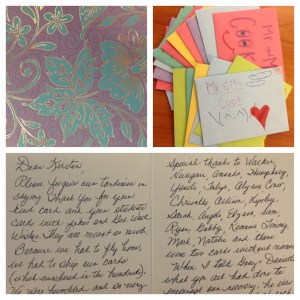 This morning I arrived at school to find a very beautiful thank you card from Mr. and Mrs. Cook. They were most appreciative of all the cards, funny jokes and get well messages we sent after their accident. Luckily, they have been able to leave Montana and go home to Virginia to continue their recovery. I have the card in the athletic training room if you would like to read it. Also, I hope this reminds all of you that a very small thing can make a very big difference in someone else’s life.